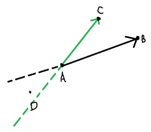Tapi bagaimana cara menghitung kasus 2? Anggap line segmen sekarang adalah AB dan kita sedang meninjau salah satu titik C yang CCW terhadap vektor \overrightarrow{AB}. Kita ingin mencari titik D sehingga tidak berpotongan dengan segmen AB. Observasinya adalah salah satu kemungkinan titik D pasti CCW terhadap vektor \overrightarrow{AC}.